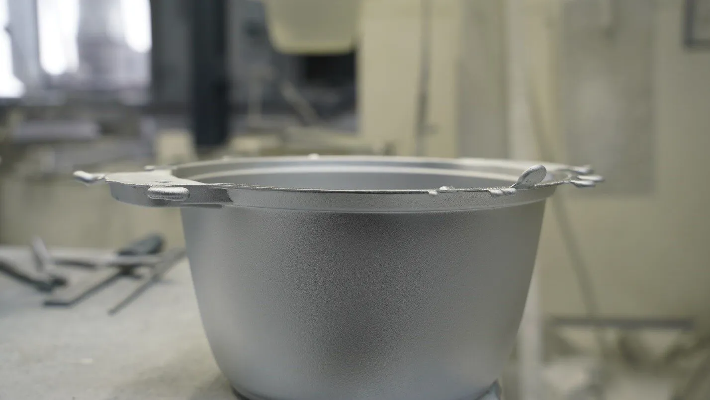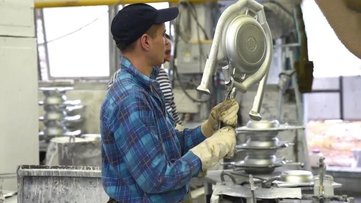 Чтобы изделие приобрело окончательный вид, проводятся дополнительные этапы обработки. Сначала при помощи пресса остывшая отливка отделяется от литника – лишнего металла, который подавался в процессе заливки в форму по специальным каналам. Затем обрабатывается верхняя кромка изделия, после чего оно принимает готовый вид. Посуда с антипригарным покрытием дополнительно проходит пескоструйную обработку, покраску и проточку дна.
