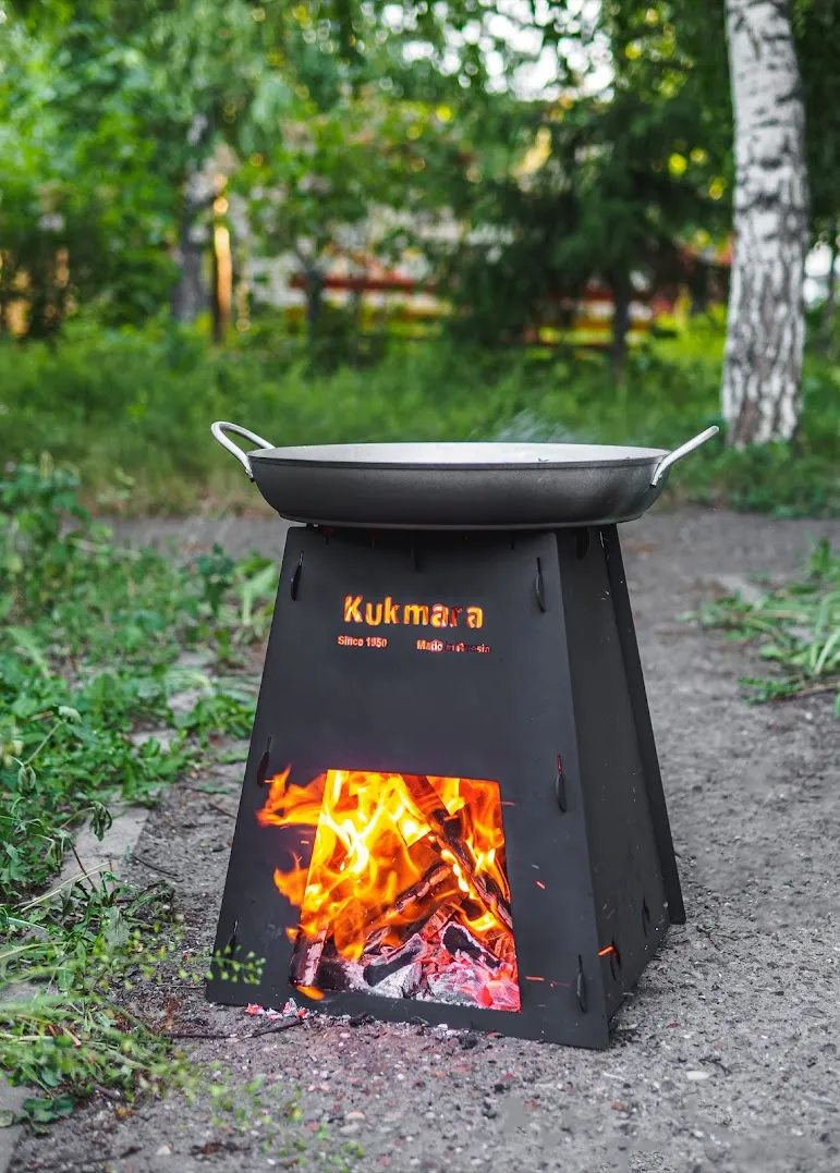 Печь походная подходит и для разогрева, и для приготовления пищи, кипячения воды, обогрева. Ее прелесть в том, что в качестве топлива для печи можно использовать щепки, ветки и небольшие дрова. Для нее подойдет и котелок, и сковорода, и чайник – конструкция устойчивая и удобная.