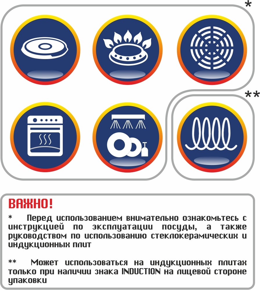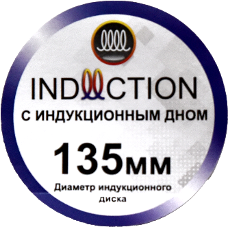 Данный стикер содержит информацию о диаметре индукционного дна и сигнализирует о том, что посуда подходит для индукционных плит!